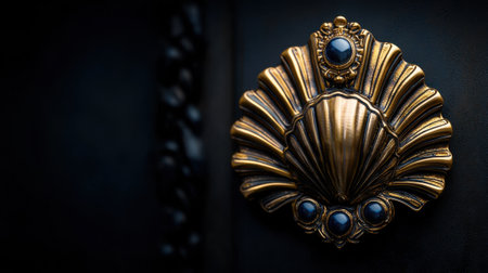 A gold and blue shell shaped object with a blue stone in the center. The shell is ornate and has a gold finish