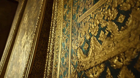 This close-up image showcases an intricate gold and blue wall design, highlighting the ornate craftsmanship and luxurious texture, perfect for interior decor themes.