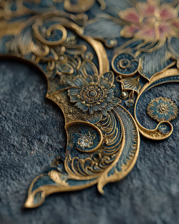 Beautiful close-up of a vintage floral design showcasing intricate details and textures. This artwork highlights craftsmanship, elegance, and ornate patterns, perfect for decoration.