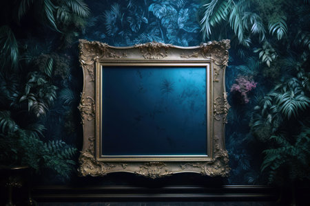 An exquisite ornate golden picture frame on a deep blue wall, ideal for showcasing art or photographs in elegant and stylish interior spaces.