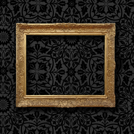 Empty antique gold colored picture frame with ornate baroque design is waiting to display your masterpiece