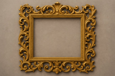 A decorative gold vintage frame, set against a gray background, capturing the charm of traditional craftsmanship and decor