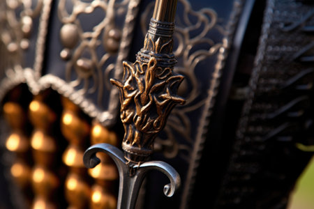 A close-up view of an intricately designed sword hilt, showcasing rich details, luxurious colors, and artistic craftsmanship.