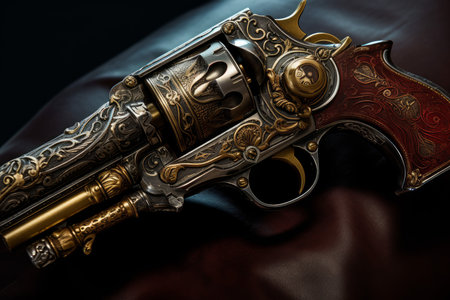 Close-up of a vintage pistol with intricate engravings, displayed on a wood background