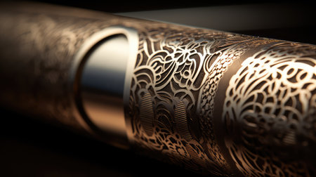 Close-up of an ornate pen featuring intricate designs and fine craftsmanship. The vintage style highlights metal detailing and elegant curves, ideal for artistic expressions.