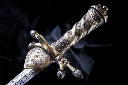 Detailed antique sword with ornate handle displayed on a black backdrop