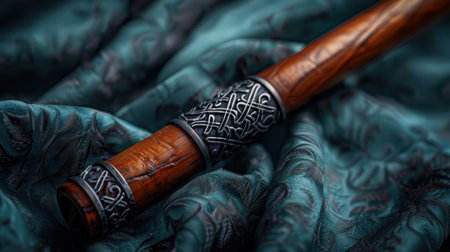 This close-up image showcases an ornate sword with a beautifully designed handle, set against rich blue fabric. Perfect for themes of craftsmanship and history.