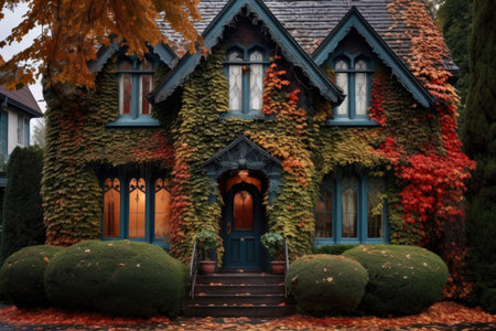 an ivy-covered exterior of a victorian house in autumn, created with generative ai