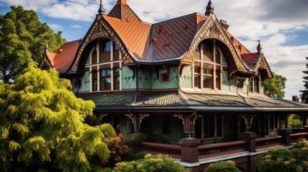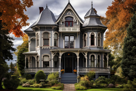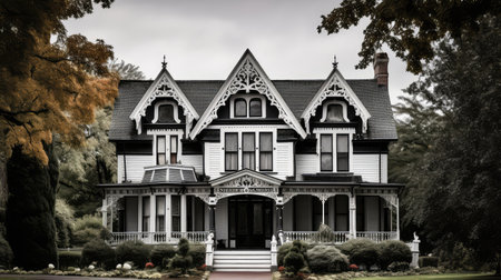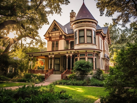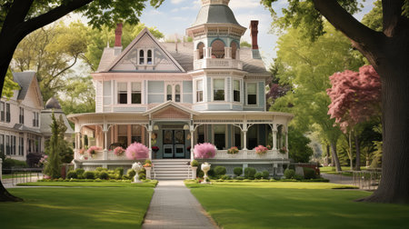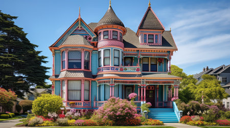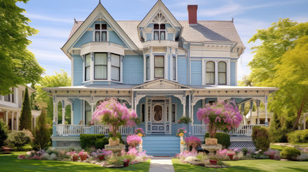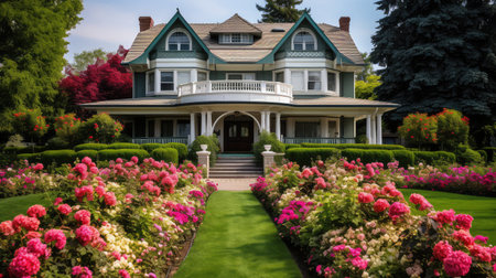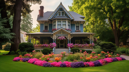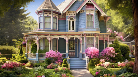 Front view of a Victorian-style house with ornate trim and a well-maintained garden. Generative AI