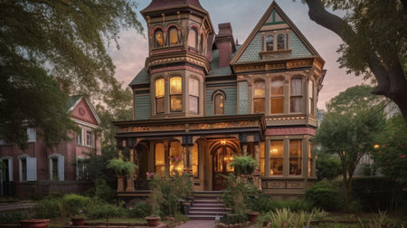 A stunning Victorian house showcasing detailed architecture, surrounded by trees and bathed in warm sunset light, creating a captivating scene.