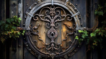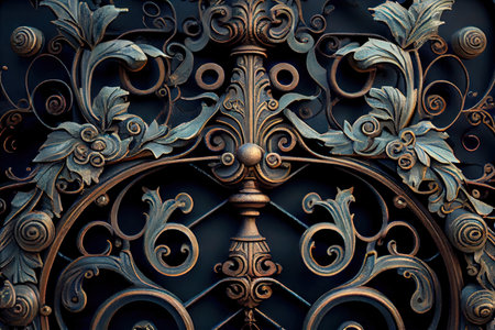close-up of intricate metalwork detail on a gate or door, created with generative ai