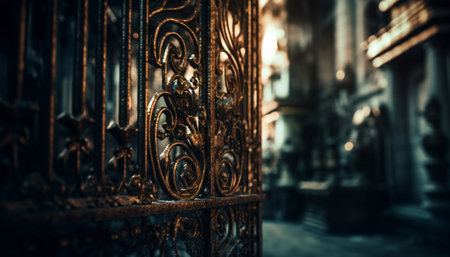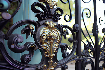 close-up of wrought iron gate with ornate details and intricate patterns, created with generative ai