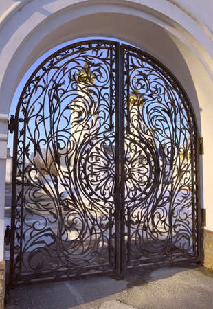 Openwork metal gates of an Orthodox church in the Old Russian architectural traditions. Novosibirsk, Siberia, Russia
