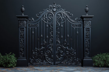 iron mansion gates with a black metal finish, surrounded by green foliage, created with generative ai