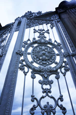 Decorative metal gate ornament. Antique iron door with classic ornaments.