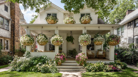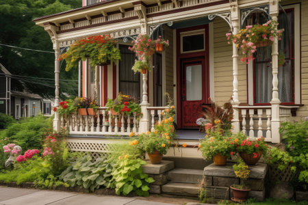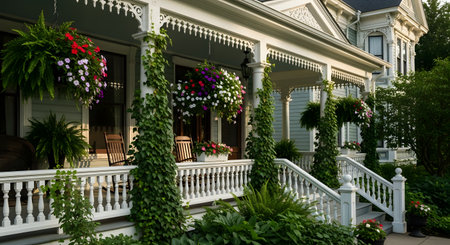 victorian house with wraparound porch and hanging plant baskets, created with generative ai