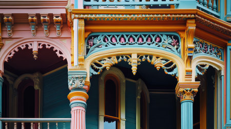 close-up of the intricate woodwork on a victorian house facade, created with generative ai