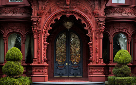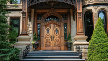 This image showcases the grand entrance of an exquisite mansion featuring intricate wooden doors, lush shrubs, and elegant stonework, reflecting timeless beauty.