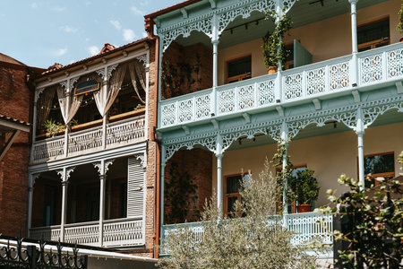 Beautiful houses in narrow streets of Tbilisi Old Town with curved balconies