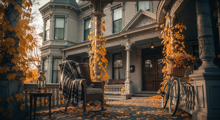 Vintage chair in front of an old house decorated with autumn leaves