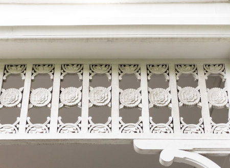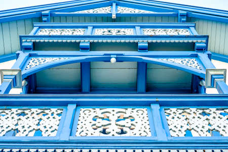 The wooden eaves with the flower stencil are decorated on the edge of the local house, front view for the background.