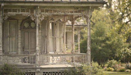the veranda, worn and weathered, stands in need of renovation, its once-charming wooden railings now faded and worn, the floorboards creaking beneath the weight of time, surrounded by overgrown greenery and vines, awaiting a fresh coat of paint and new life. ai generated