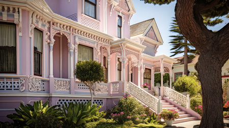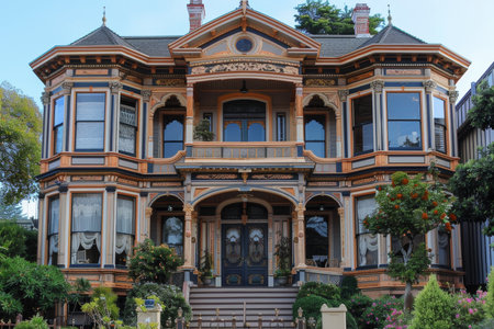 Front view of a Victorian-style house with ornate trim and a well-maintained garden. Generative AI