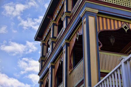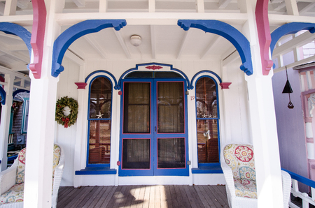 Cape May, NJ - 12 June 2019: Entrance to Victorian painted wooden homes in the historic downtown area of the city