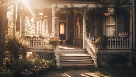 A vintage home with a spacious porch bathed in the warm sunlight. The white wooden steps leading to the entrance are inviting, and the surrounding lush greenery creates a charming and serene atmosphere.