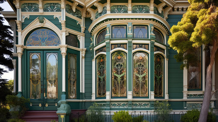 a close-up of a victorian houses intricate wooden trim and bay windows, created with generative ai
