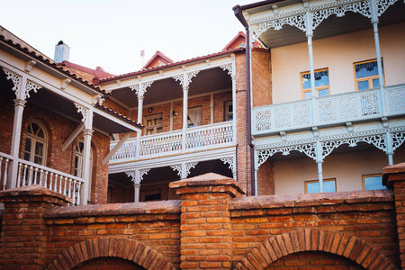 Brick houses in narrow streets of Tbilisi Old Town with curved balconies and beautiful metal gates
