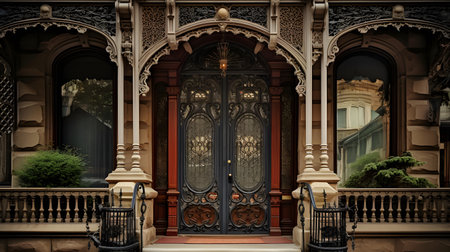 victorian house with black metal fence, white wooden door and stained glass window, created with generative ai