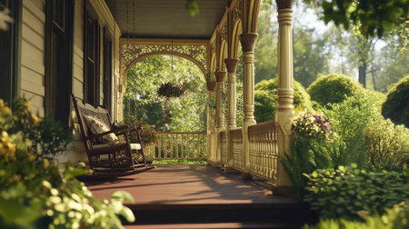 Front porch of a Victorian home with ornate railings, a swing and intricate decorations generative ai