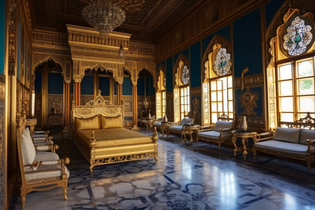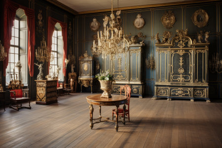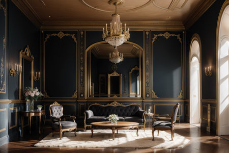 An opulent interior scene features antique furniture, including chairs and a table. Large arched windows offer views of the exterior, with sunlight filtering through. The composition showcases a classic architectural style with intricate details. It may be suitable for illustrating historical themes, luxury living, or interior design concepts.