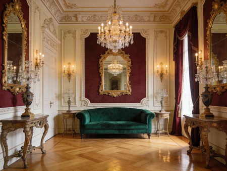 Discover the opulent beauty of a luxurious historical room featuring elegant decor, a crystal chandelier, and vintage furnishings that exude sophistication.