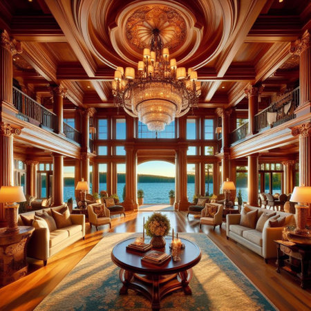 This image showcases the interior of a grand and opulent mansion,featuring a stunning hallway with intricate architectural details,including a magnificent staircase,ornate wood paneling,and a