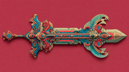 This striking image showcases an intricately designed sword featuring vibrant colors and detailed craftsmanship, perfect for fantasy-themed projects or artwork.