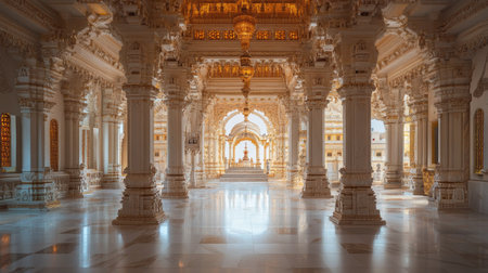 Serene Jain temple interior with soft lighting, no people, tranquil atmosphere, copy space