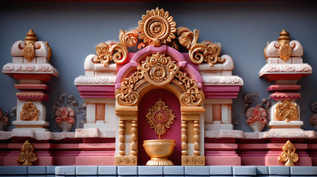 This stunning architectural detail showcases intricate carvings adorned with golden and pink hues, set against a captivating blue background, reflecting cultural artistry.
