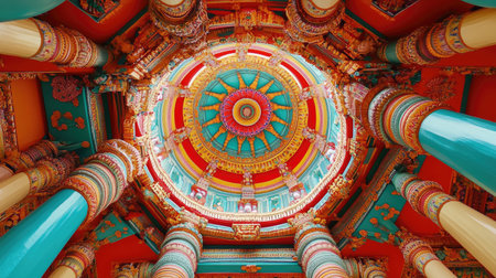 Explore the stunning ceiling of a cultural temple, showcasing vibrant colors and intricate patterns. This artwork reflects rich heritage and spirituality.