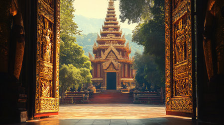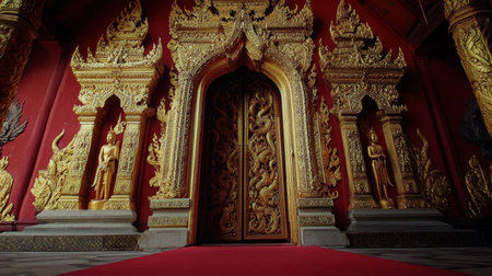 Stunning entrance of a temple showcasing intricate gold carvings against a vibrant red backdrop. A symbol of spirituality and rich cultural heritage.