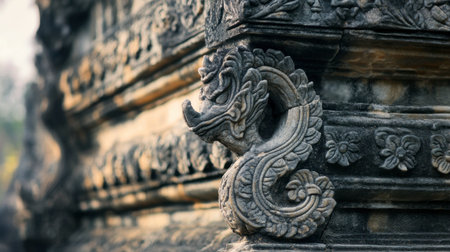 A close-up shot of the intricate stone carvings at Prasat Hin Phimai, a Khmer-style temple in northeast Thailand.