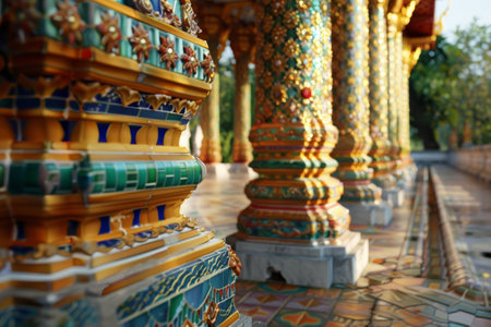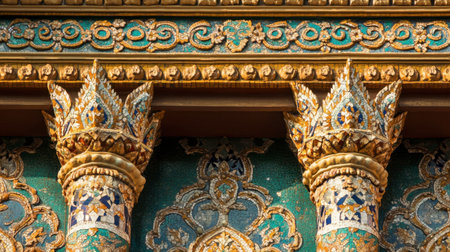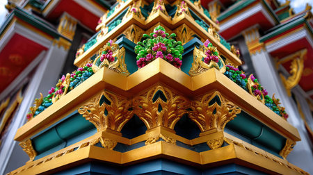 Explore the vibrant and intricate details of traditional temple architecture, showcasing stunning colors, gold accents, and artistic craftsmanship in this captivating close-up image.