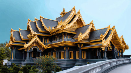 This captivating image features a beautifully detailed Asian temple, showcasing its stunning golden accents and intricate designs against a serene blue sky backdrop.