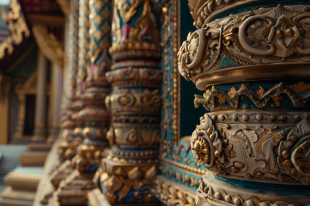 Elaborate columns display detailed relief carvings with golden embellishments. The repetitive pattern and texture are highlighted by the overhead lighting, creating a captivating visual effect. The design suggests an architectural detail of a historical building, suitable for illustrating cultural heritage or design concepts.