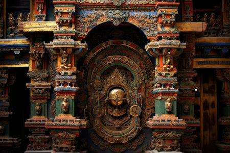 a close-up of the intricate carvings on a hindu temples entrance gate, created with generative ai