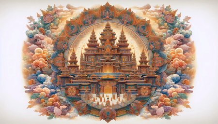 Explore an artistic representation of a beautiful temple surrounded by lush greenery, showcasing intricate architectural details and serene atmosphere.