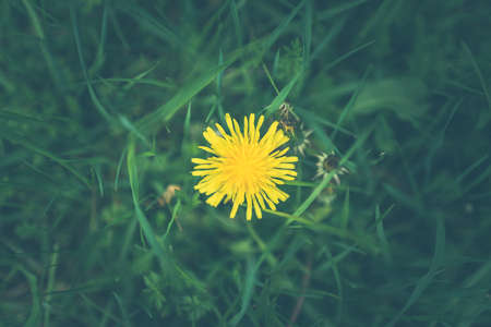 Small yellow flowers on a green meadow in summer, retro toned