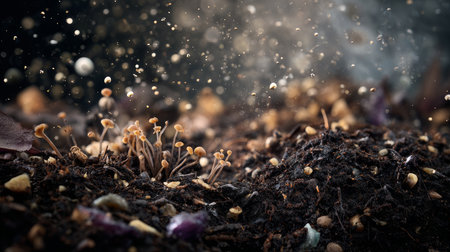 Mushrooms thrive on rich soil with varied textures and colors in natures habitat