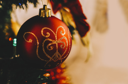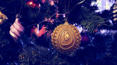Closeup of Christmas tree decorations. Selective focus with retro faded colors